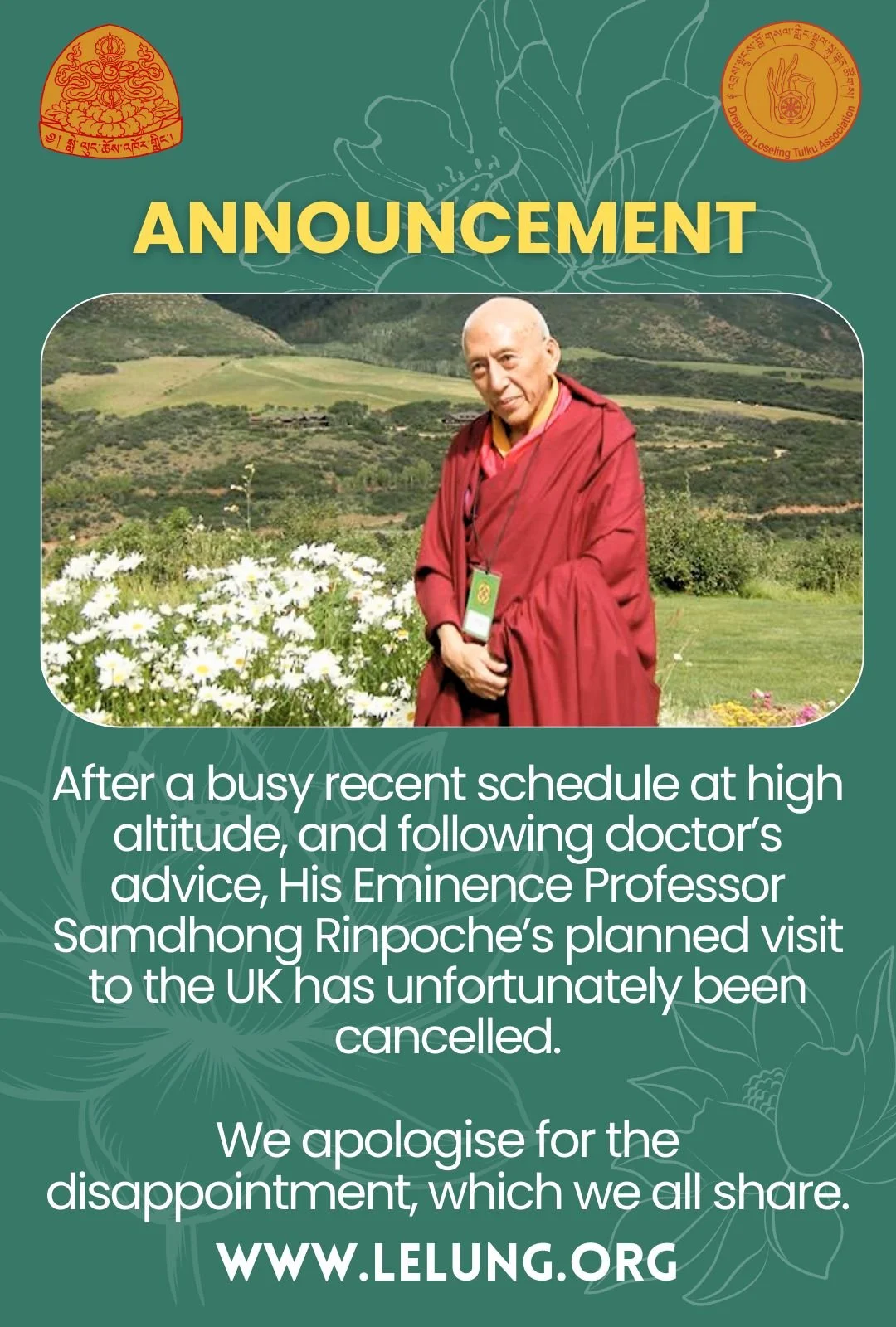 After a busy recent schedule at high altitude, and following doctor’s advice, His Eminence Professor Samdhong Rinpoche’s planned visit to the UK has unfortunately been cancelled.